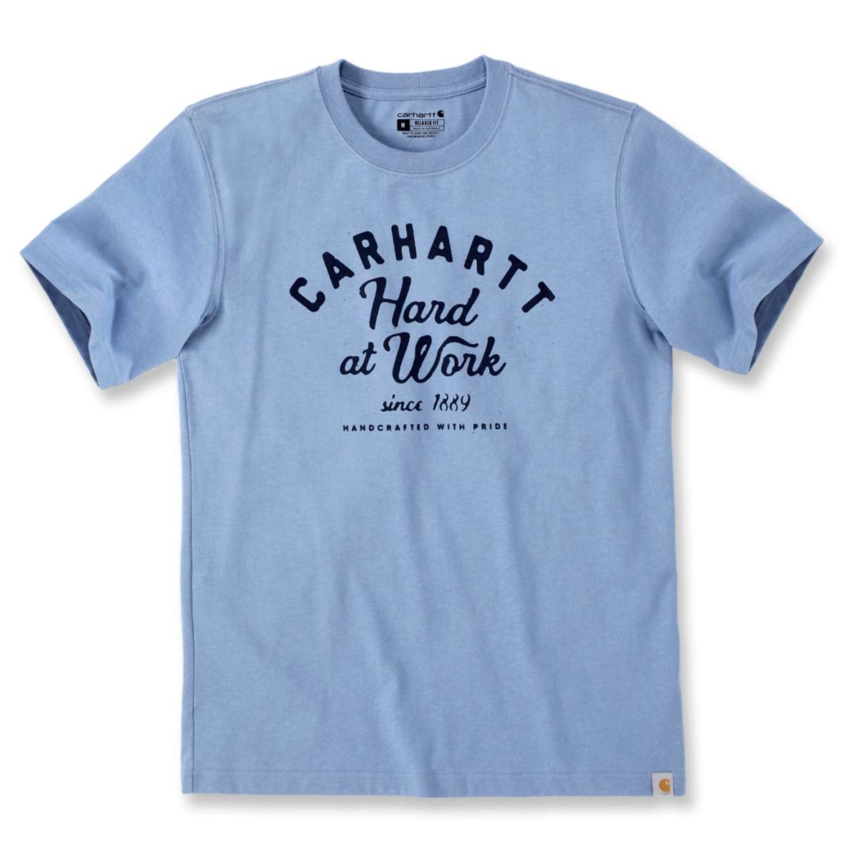RELAXED FIT – רילקסד פיט משקל 230 GSM הרכב אפור אבן: 100% כותנה הרכב כחול אבן שמיים: 60% כותנה / 40% פוליאסטר שרוולים קצרים סרט צוואר מבד ריב Carhartt graphic on front תווית לוגו קארהארט במכפלת