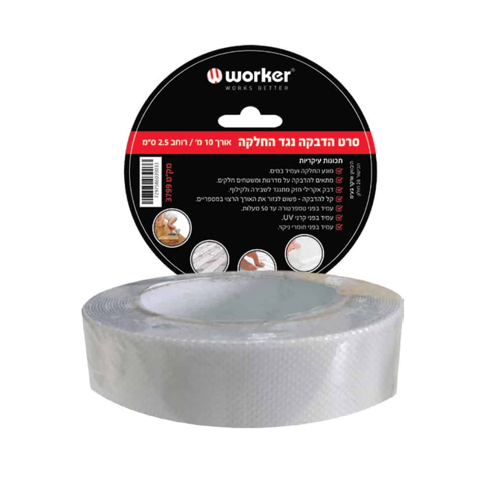 מידות – רוחב: 2.5 ס"מ , אורך: 10 מ' צבע – לבן מונע החלקה ועמיד במים. מתאים להדבקה על מדרגות ומשטחים חלקים. דבק אקרילי חזק מתנגד לשבירה ולקילוף. קל להדבקה – פשוט לגזור את האורך הרצוי במספריים. עמיד בפני טמפרטורה עד 50 מעלות. עמיד בפני קרני UV. עמיד בפני חומרי ניקוי.