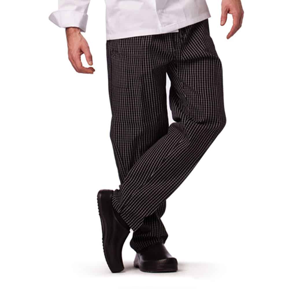 הרכב בד: 65% פוליאסטר 35% כותנה משקל בד: 220 גרם למ"ר 2 כיסים קידמיים חיצוניים 2 כיסים אחוריים גומי רחב בגובה 5 ס"מ עם סרט קשירה פנימי להידוק מכנסי שף / מכנסי טבח