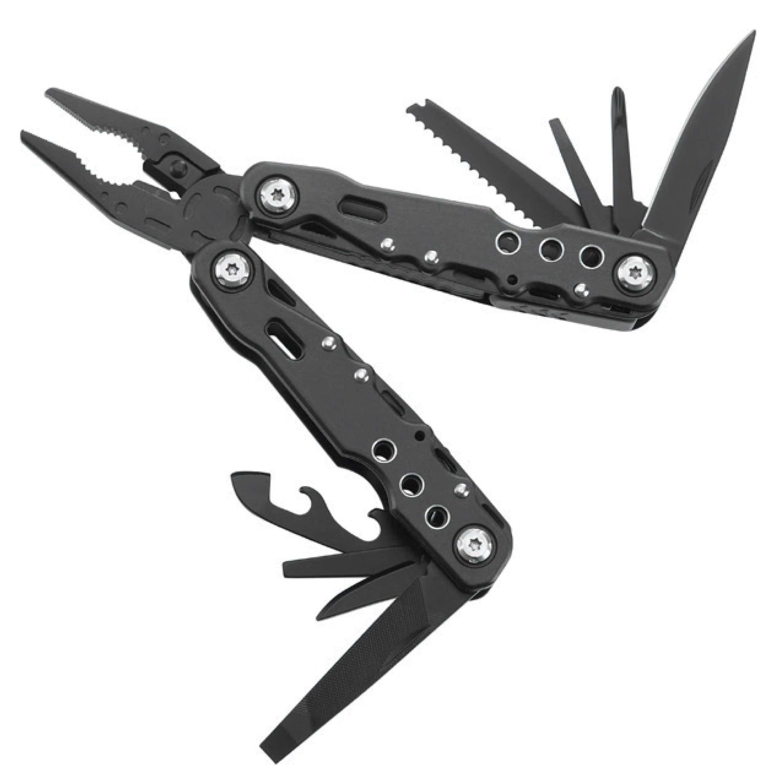 15 כלים בכלי רב שימושי אחד: פלאייר שפיץ, פלאייר, קוצץ חוטים, קוצץ תיל, חושף חוטים, סכין חדה, סכין משוננת, פותחן פחיות, פותחן בקבוקים, שופין עץ ומתכת, מברג פיליפס, מברג גדול, בינוני וקטן, נעילת בטיחות