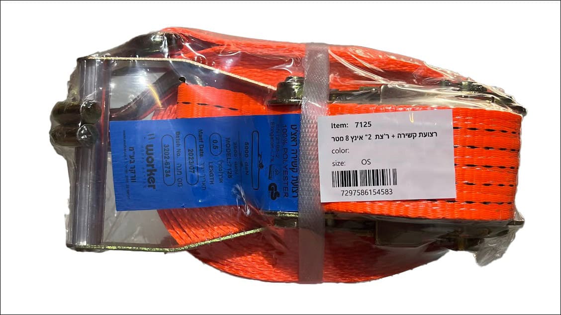 תקן: EN 12195-2:2001 רצועות קשירה- לקיבוע מטענים בעת הובלה/ שינוע סחורה רצועות איכותיות הכוללות מותחן ממתכת אורך 8 מטר רוחב 50 ממ' עומס קריעה מקסימלי 5 טון