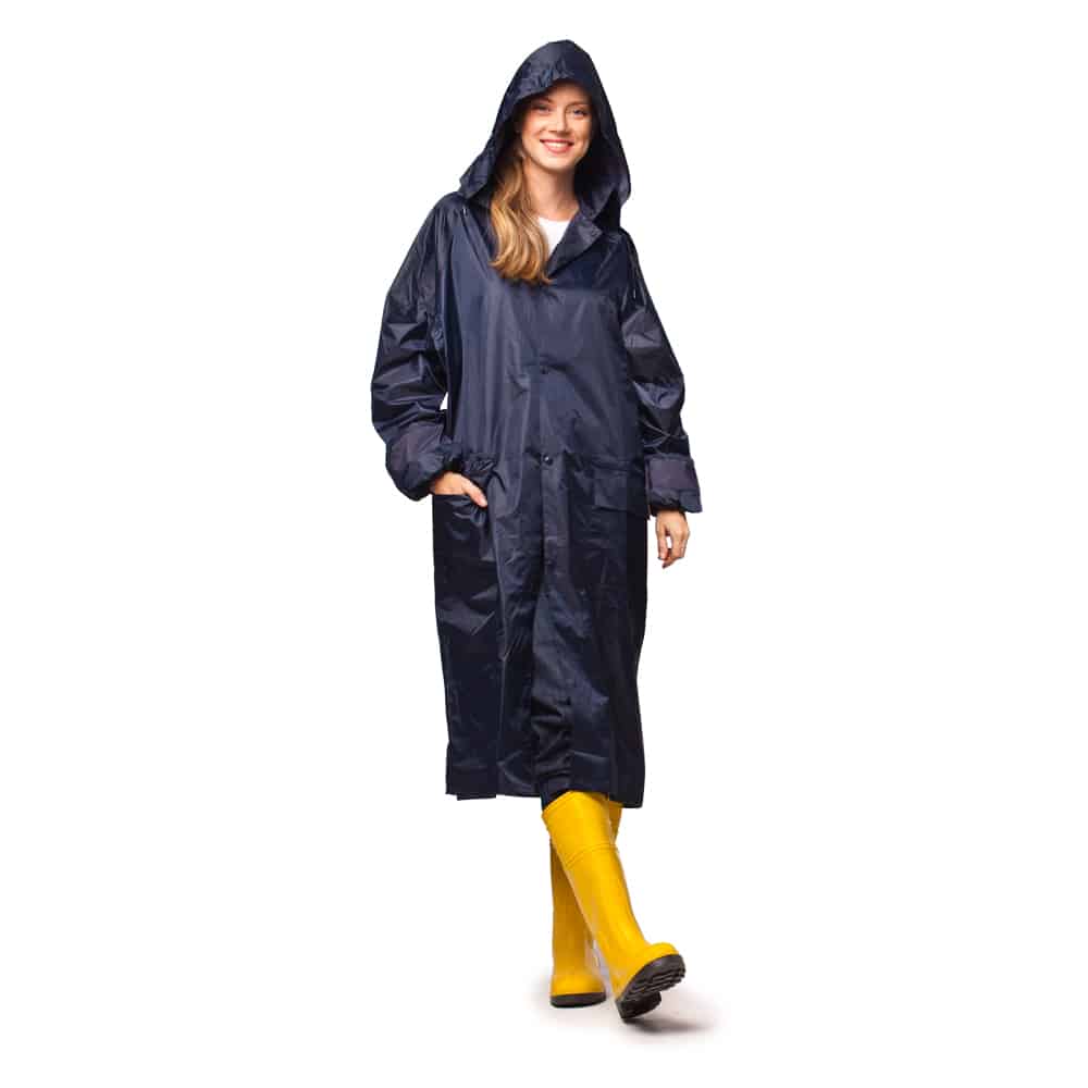 הרכב בד: 100% פוליאסטר, ציפוי T 190 PVC משקל בד: 190 גרם למ"ר שכמיה עם כובע להגנה מפני גשם WATERPROOF H2O בטכנולוגיה של תפרים חתומים רוכסן קדמי מכוסה 2 כיסים קדמיים עם קלפה להגנה ממים התפרים מכוסים בסרט ניילון ומודבקים בחום נגד חדירת מים התקן גומי הסוגר את היד הרמטית בשרוולים רשת לאוורור בחלק האחורי של השכמייה לנוחות לבישה פסים זוהרים בחזית