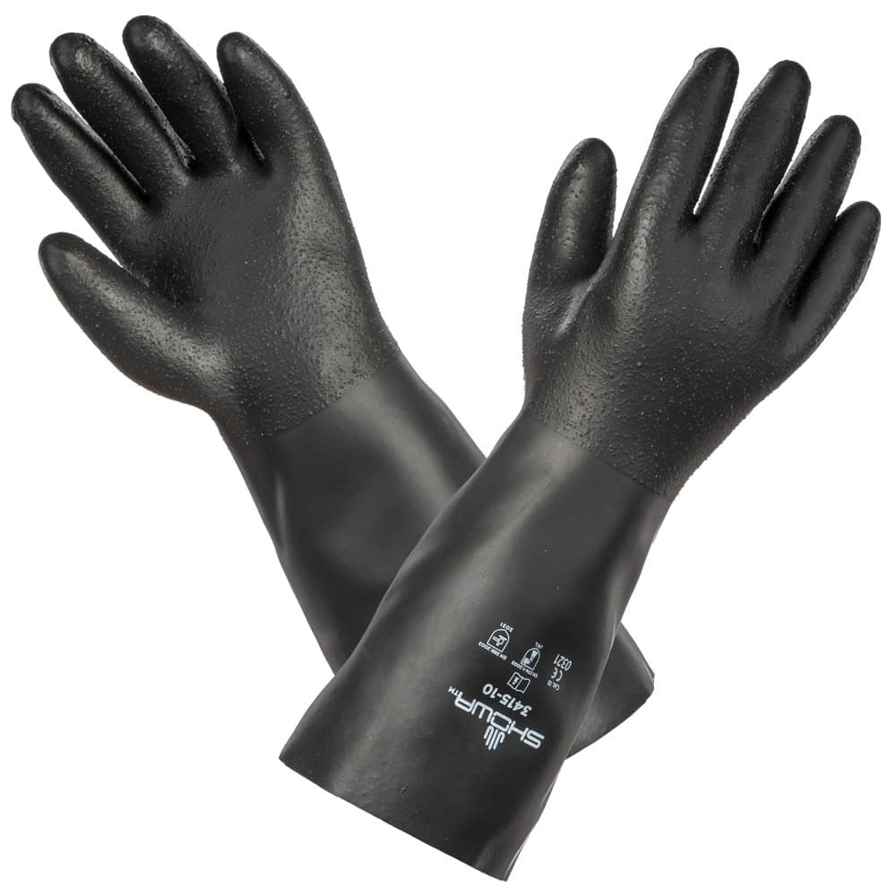EN ISO 374-5 , EN388:2016 EN ISO 374:2016 אורך: 355 מ"מ עובי: 1.30 -1.80 מ"מ כפפות SHOWA 3415 נותנות הגנה מפני כימיקלים מגוונים כולל: חומצות, סולבנטים, שמן וגריז גמישות מאוד, בעלות גימור מחוספס לאחיזה מצויינת וחוזק מכאני גבוה בפני שפשוף בטנה פנימית סרוגה ללא תפרים לנוחות מקסימלית לעבודות בתעשיות כימיקלים, פטרוכימיה, דלק, נפט, מתכת