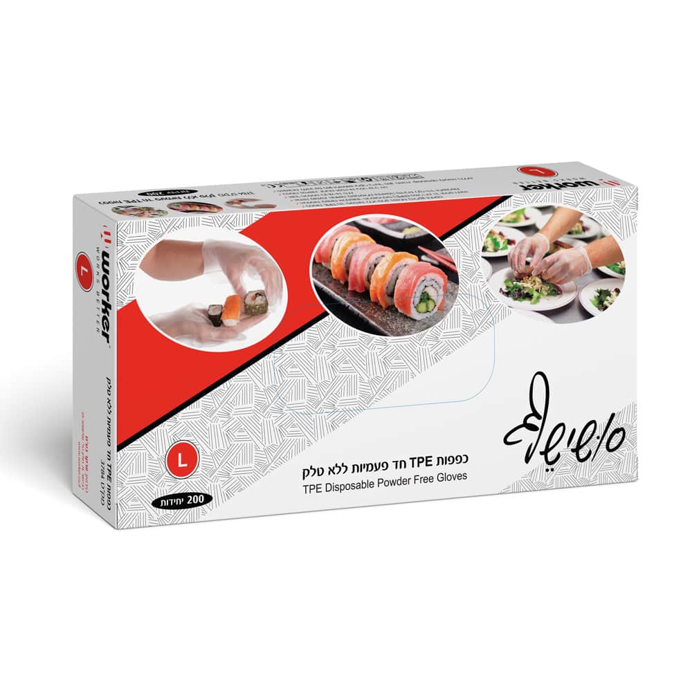 עשויות 100% ניטריל עומדות בתקנים: EN374 , EN38 כפפות TPE חד פעמיות ללא טלק, נטול סיליקון ולטקס עשויות אלסטומר תרמופלסטי (TPE) נטול ריח, רך ונעים למגע מתאימות לעבודה בתנאים רטובים, יבשים ושומניים מומלץ עבור הכנת מזון, שחיטה, עיבוד בשר, שימוש ביתי וטיפול במזון שומני מאושרות למגע עם מזון ולשימוש עיקרי בייצור מזון, מטבח, קוסמטיקה ותעשיה כללית