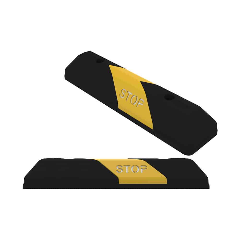 מעצור חניה באורך 60 ס"מ בעל נראות גבוהה עם כיתוב רפלקטיבי STOP דו צדדי בעת חשיכה עמיד בפני פגעי מזג אוויר ובטמפרטורות קיצוניות ניתן לקיבוע על הקרקע באמצעות 2 ברגים