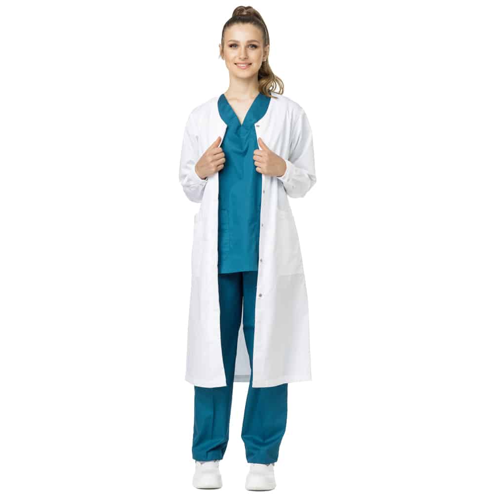 65% כותנה ו-35% פוליאסטר חלוק בגזרה אופנתית לענף הרפואה והסיעוד מפתח צוואר מעוגל שרוול ארוך אורך עד הברך סגירת תיק תק ושינה נסתרת