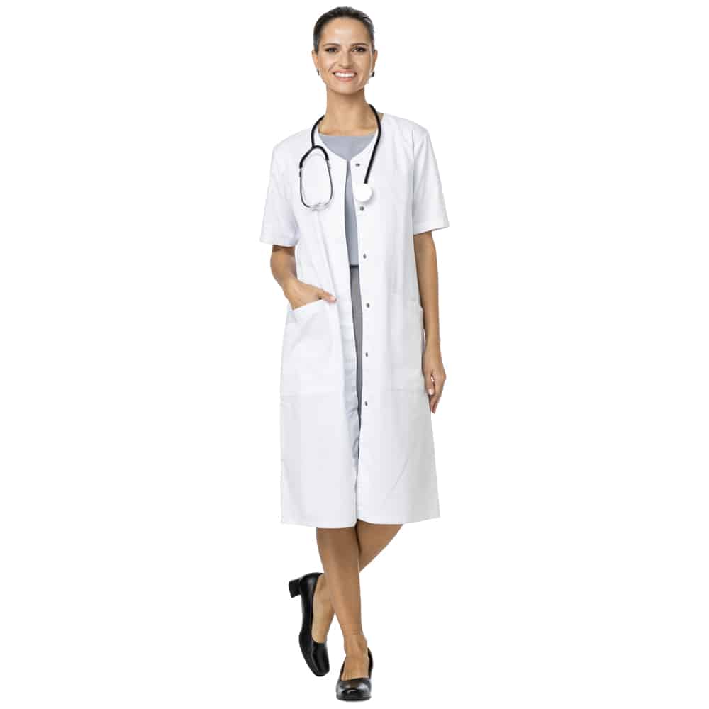חלוק בגזרה אופנתית לענף הרפואה והסיעוד מפתח צוואר מעוגל שרוול קצר אורך עד הברך סגירת תיק תק ושינה נסתרת